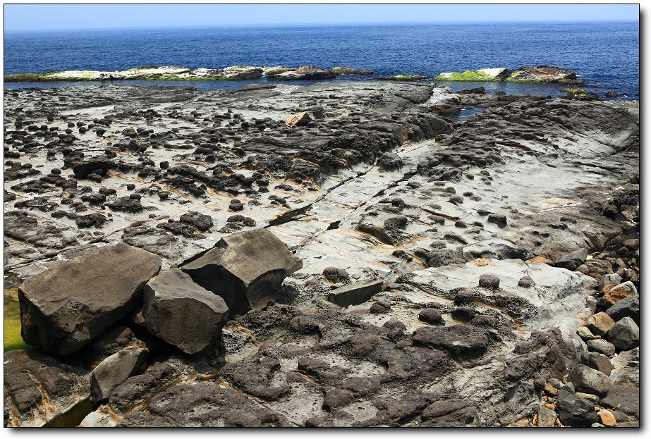 上面這張照片是位於鼻頭角下方海域的海蝕平台,一格一格的很像排列整齊的豆腐,所以叫「石腐岩」。