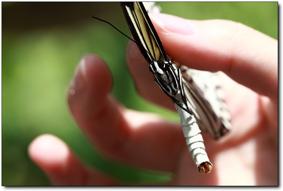 據工作人員說,這隻黃裳鳳蝶是特有生物中心送來的,翅膀上的黃色花紋真是漂亮!而且牠居然做出產卵的動作,難道真的要生蛋了嗎?呵呵!