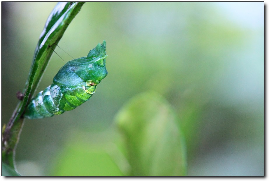大白斑蝶的蛹則是金黃色的,很閃亮,也具有警示的作用,讓鳥不敢吃。