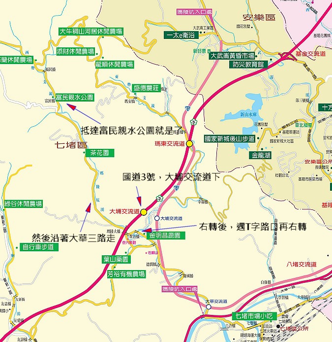 走國道三號往基隆方向,在大埔交流道下,再沿著指標,或是問當地人「富民親水公園」,就可以到了!