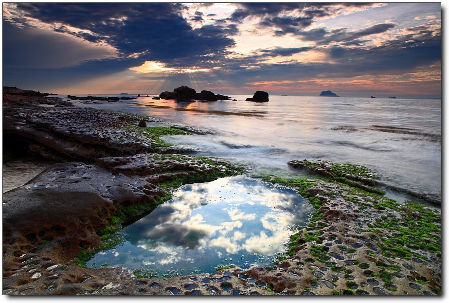 陽光已經從雲層的破洞射出,而那個積水的窪洞,有如明鏡一般倒映著天空的顏色!這樣的景致真是太迷人了!